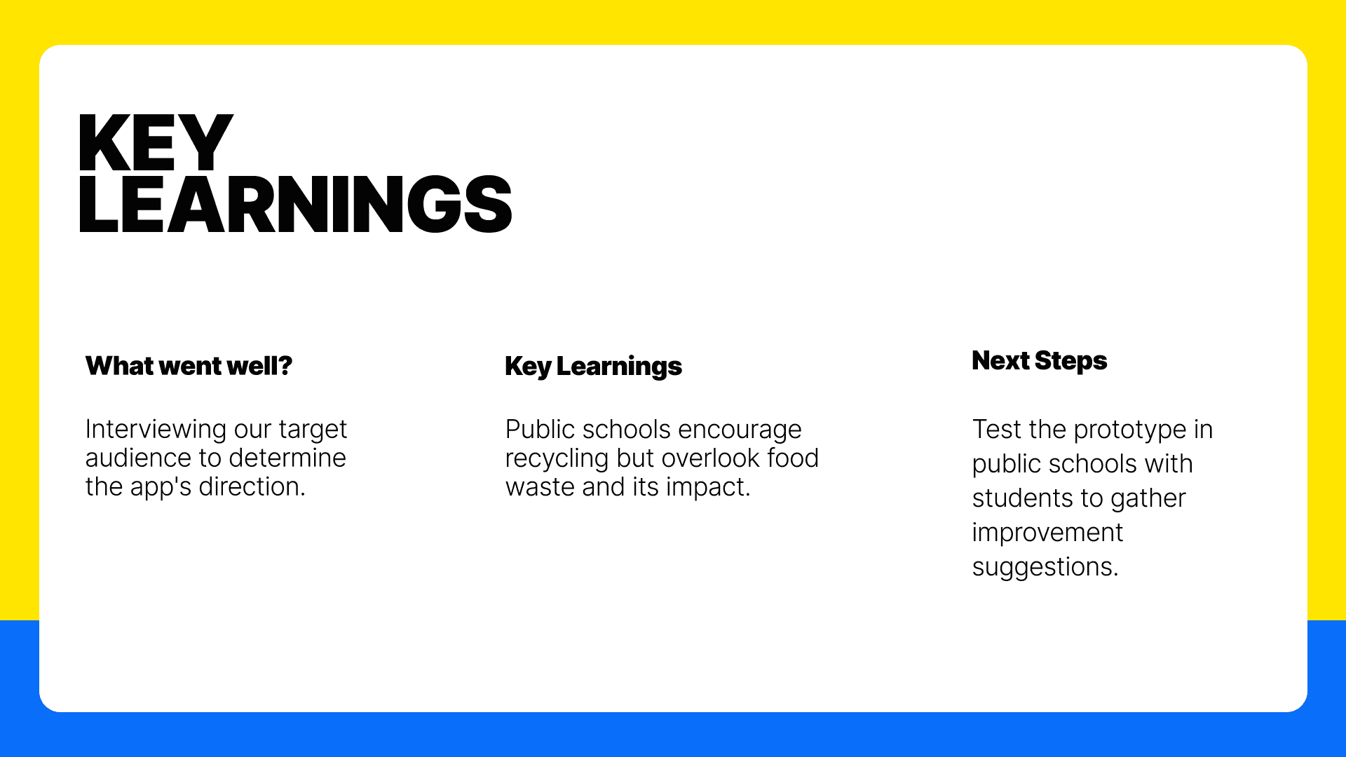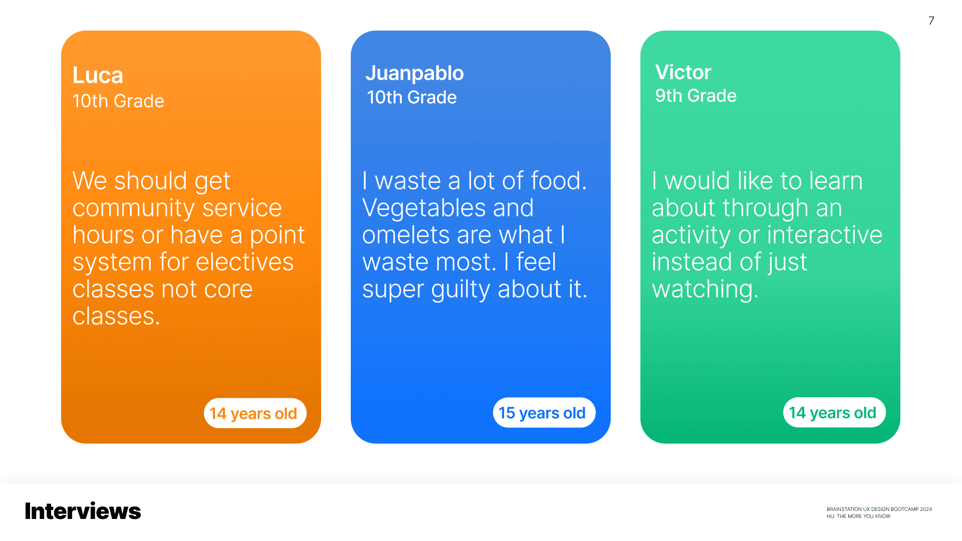 The interviews revealed that students care about food waste, but often lack awareness of its long-term impact. Many admitted they throw food away without thinking, and several said they would be motivated by rewards, progress tracking, or peer competition.