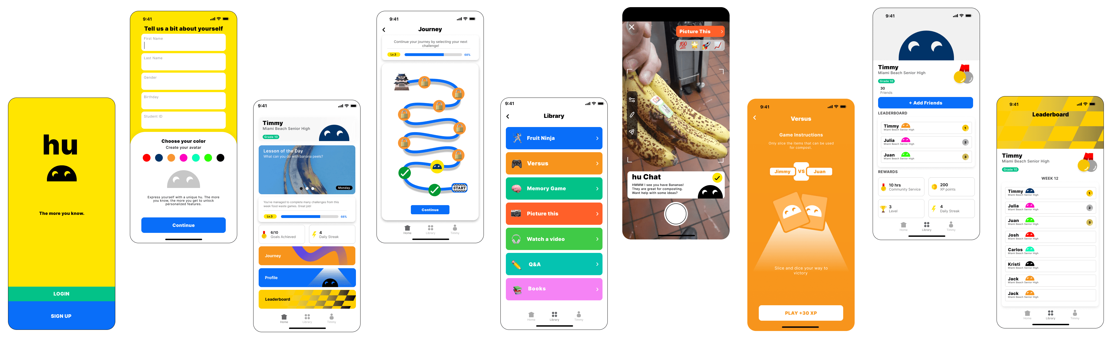 We designed the HU App, an interactive platform that uses gamification, rewards, and impact tracking to engage students in learning about food waste. By combining education with playful design, the app empowers students to take meaningful action toward building sustainable habits.