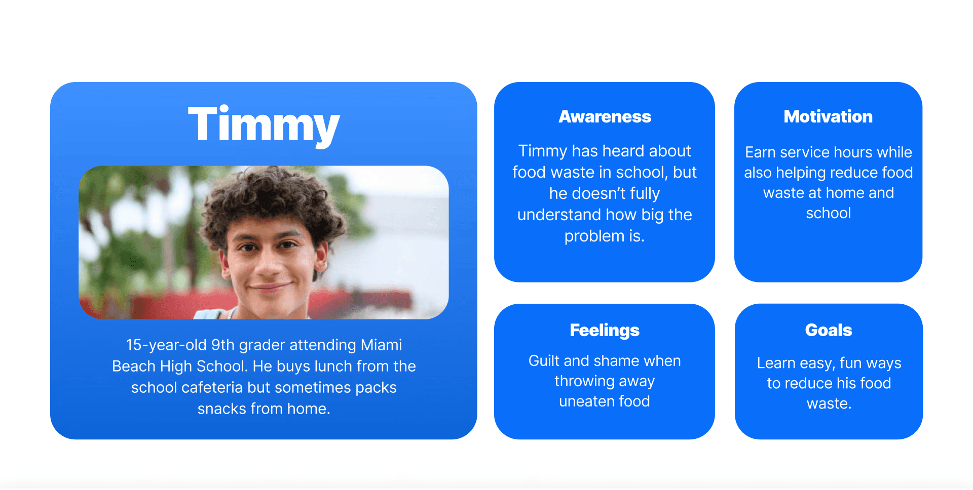 Timmy represents students who lack awareness of food waste but are motivated by rewards and playful learning.